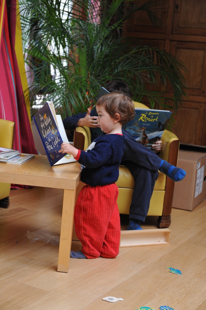 Séance de lecture. Marin plongé dans le roman de renart (et perplexe à cause du "t", il a suppposé que c'était une jeu de mot avec le t de taquin). Pendant une semaine, Ulysse voulait "tôp, tôp, tôp", comprenez la petite taupe (qui voulait savoir qui lui avait fait sur la tête ; désormais c'est "chat pe'du" (le petit chat perdu - père castor). Enfin j'exagère pour le "pe'du" car depuis deux semaines, Ulysse sait prononcer "Merrci, Marr'in".